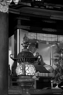 banque me regarde, sourcilleux. 花園寺ノ前町. Le toit d’un temple se devine au-dessus d’une